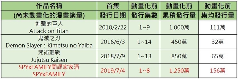 (SPYxFAMILY間諜家家酒漫畫單行本銷售趨勢)